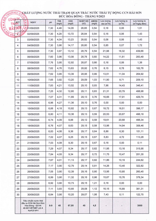 Chất lượng nước thải CCN Hải Sơn Đức Hòa Đông - Tháng 9