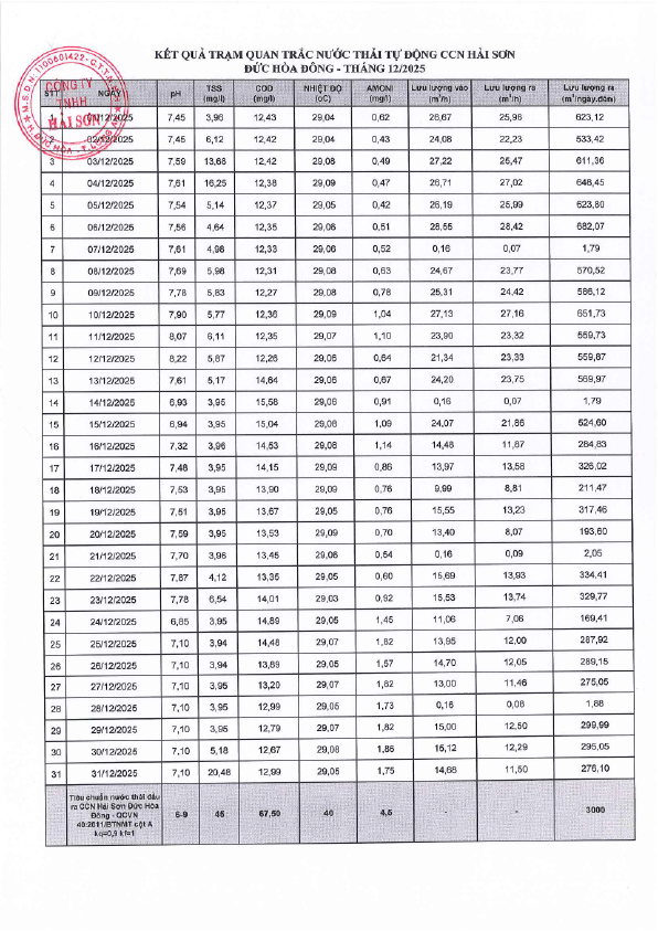 Chất lượng nước thải CCN Hải Sơn Đức Hòa Đông - Tháng 12