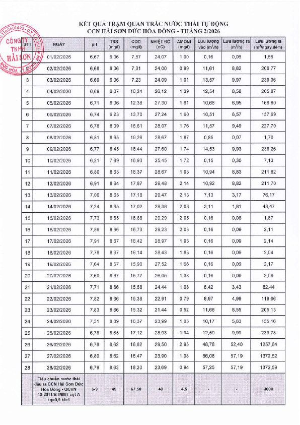 Chất lượng nước thải CCN Hải Sơn Đức Hòa Đông - Tháng 2 năm 2025