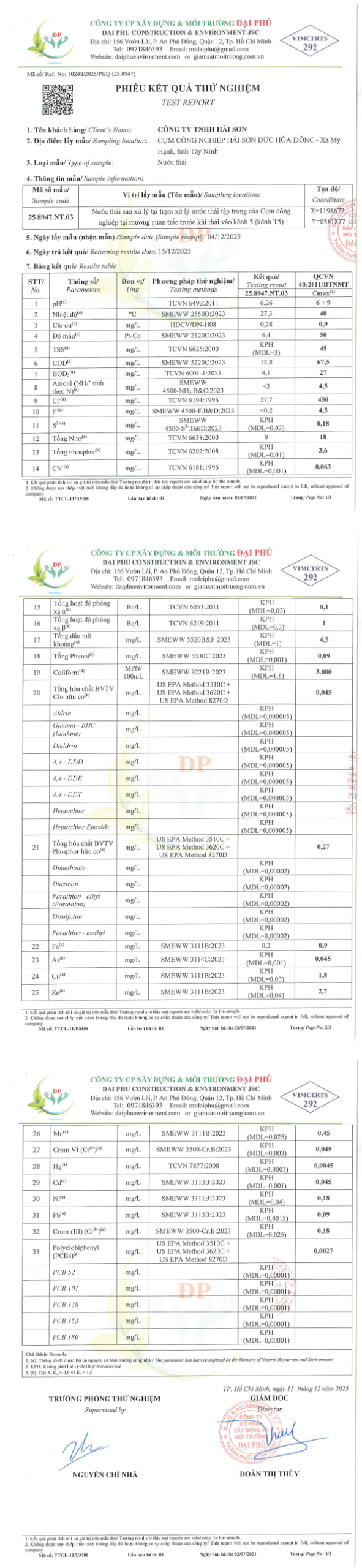 Kết quả phân tích nước thải định kỳ Quý 3/2025