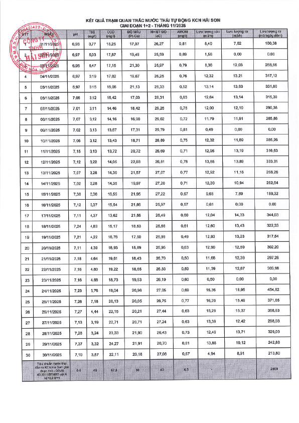 Chất lượng nước thải trạm quan trắc KCN Hải Sơn GĐ 1-2 - Tháng 11 năm 2025