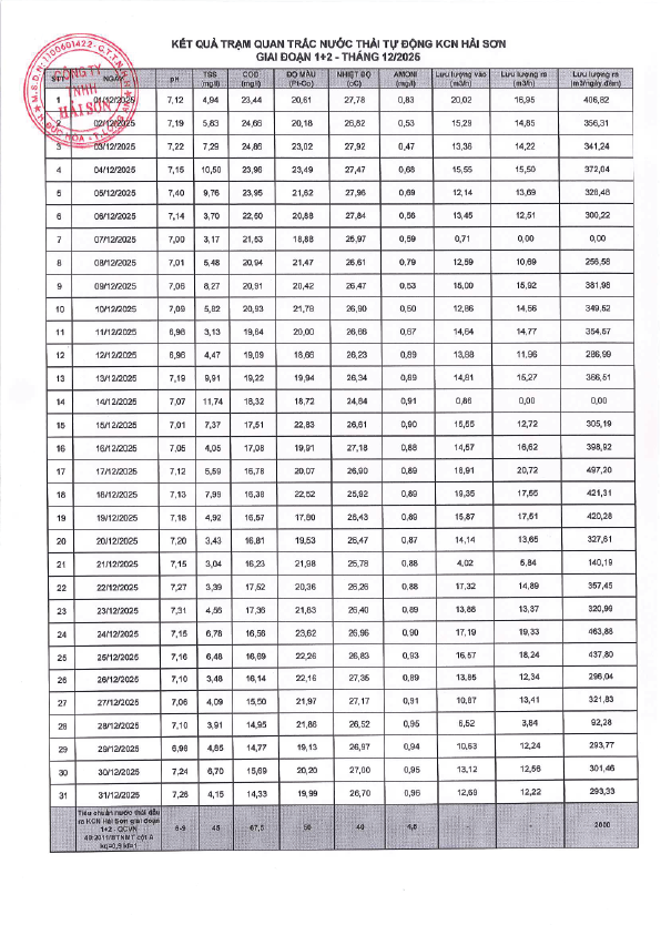 Chất lượng nước thải trạm quan trắc KCN Hải Sơn GĐ 1-2 - Tháng 12 năm 2025