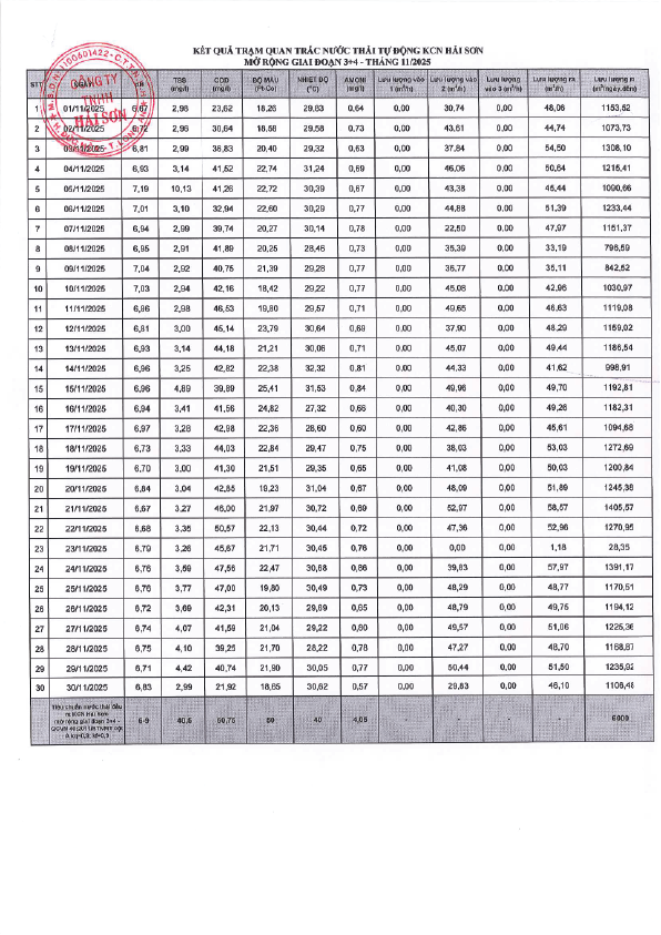 Chất lượng nước thải trạm quan trắc KCN Hải Sơn GĐ 3-4 - Tháng 11 năm 2025