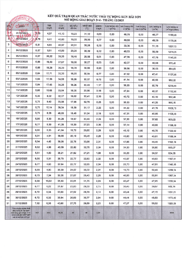 Chất lượng nước thải trạm quan trắc KCN Hải Sơn GĐ 3-4 - Tháng 12 năm 2025